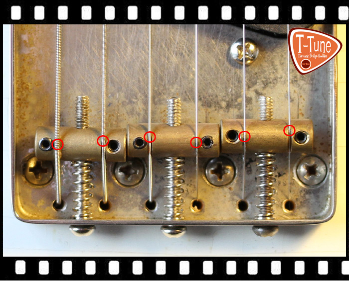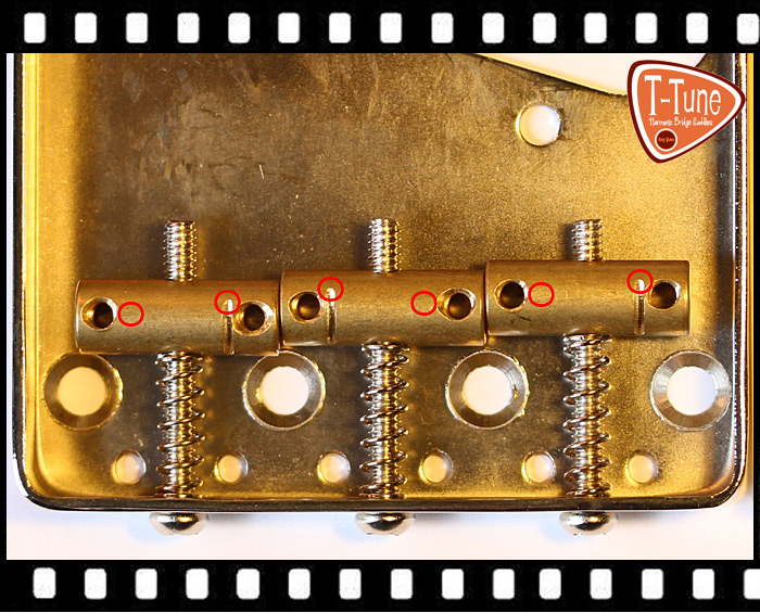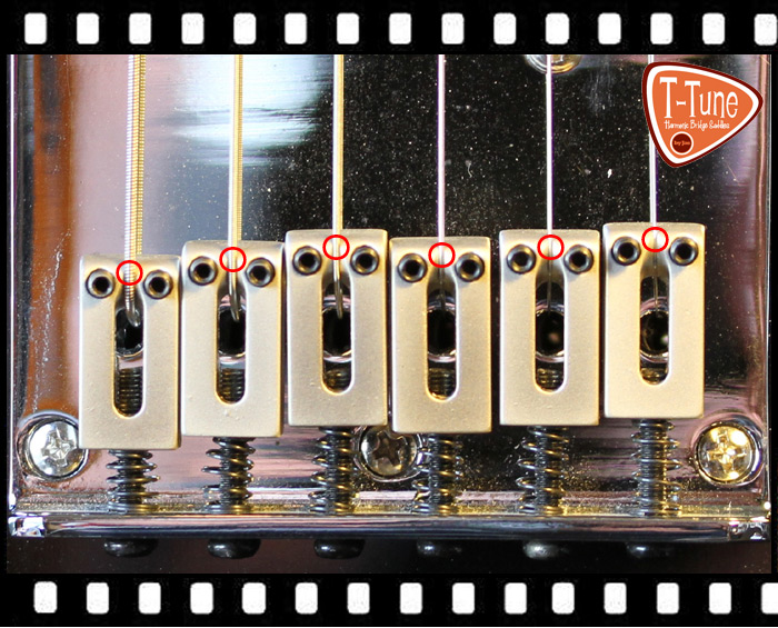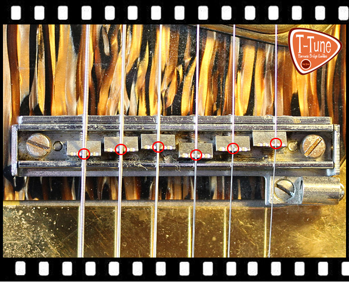Because the portion of the string that makes contact with the bridge saddle is rigid, the string does not vibrate directly from this position but from a point just in front of the saddle. This results in a shortening of the “speaking length” of the string in relation to its scale length of between 1-5 mm, depending on the string gauge. This means that if we set the bridge saddles so that the point of contact between saddle and string corresponds exactly to the scale length (double the distance from the nut to the 12th fret; all saddles in a row), without taking the rigid, non-vibrating part of the strings into account, notes played at the 12th fret will, as a rule, be sharp – because the strings are “too short”! If we wish to achieve the correct pitch, we have to “lengthen” the strings in order to compensate for this anomaly – even more so in the case of heavier gauge strings, which are even more rigid. Adding the length of the non-vibrating part of the string to its speaking length in this way can be described as “octave compensation”.
